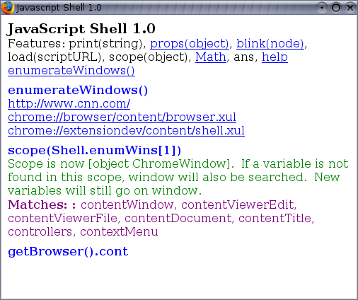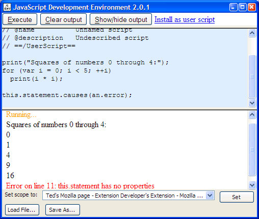 Jesse Ruderman's Javascript Environment allows you to run blocks of javascript code. Like the Javascript Shell, this version has chrome privileges, so you can use XPCOM objects. Useful for testing code snippets, or entire files! Try it online!