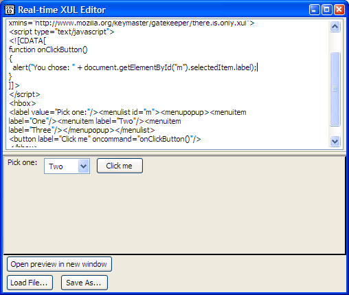The Live XUL Editor allows you to edit XUL with a realtime preview. Quickly prototype your XUL layout with ease! Try it online!
